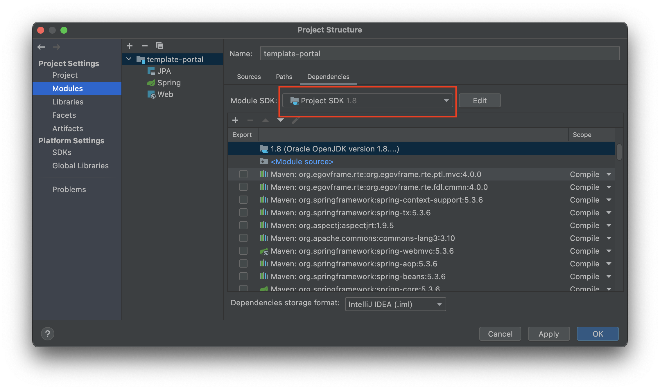 눌러보면 왼쪽에 프로젝트와 모듈스가 있습니다. 버전을 맞춰줍니다. java 11이었는데 8로 바꿔줬어요. 이클립스에서도 java8을 썼어요
