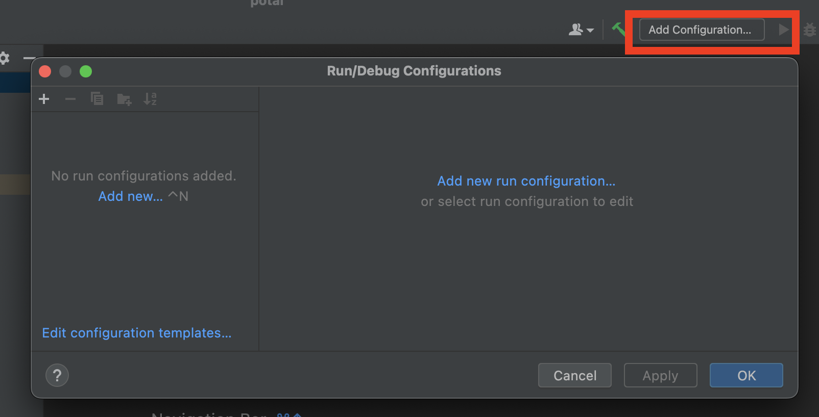 오른쪽 위 Add Configuration을 눌러서 창을 띄운 후에 왼쪽 위 +버튼을 눌러줍니다.