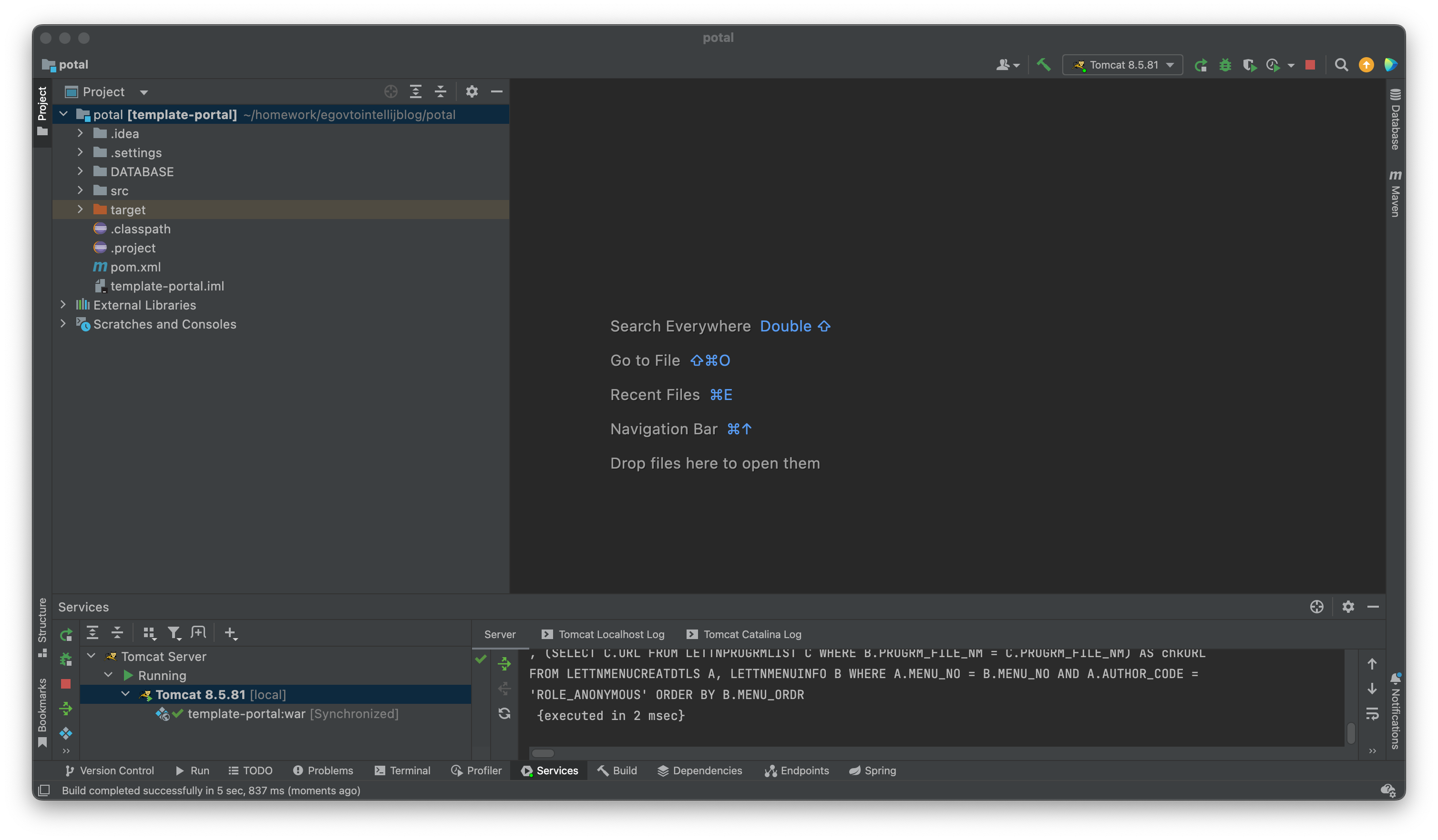 eclipse에서 잘 작동되는 상태에서 가져와서 DB설정도 모두 마친 상태 입니다. 인텔리제이에서는 소스를 건드리지 않고 바로 킨겁니다!