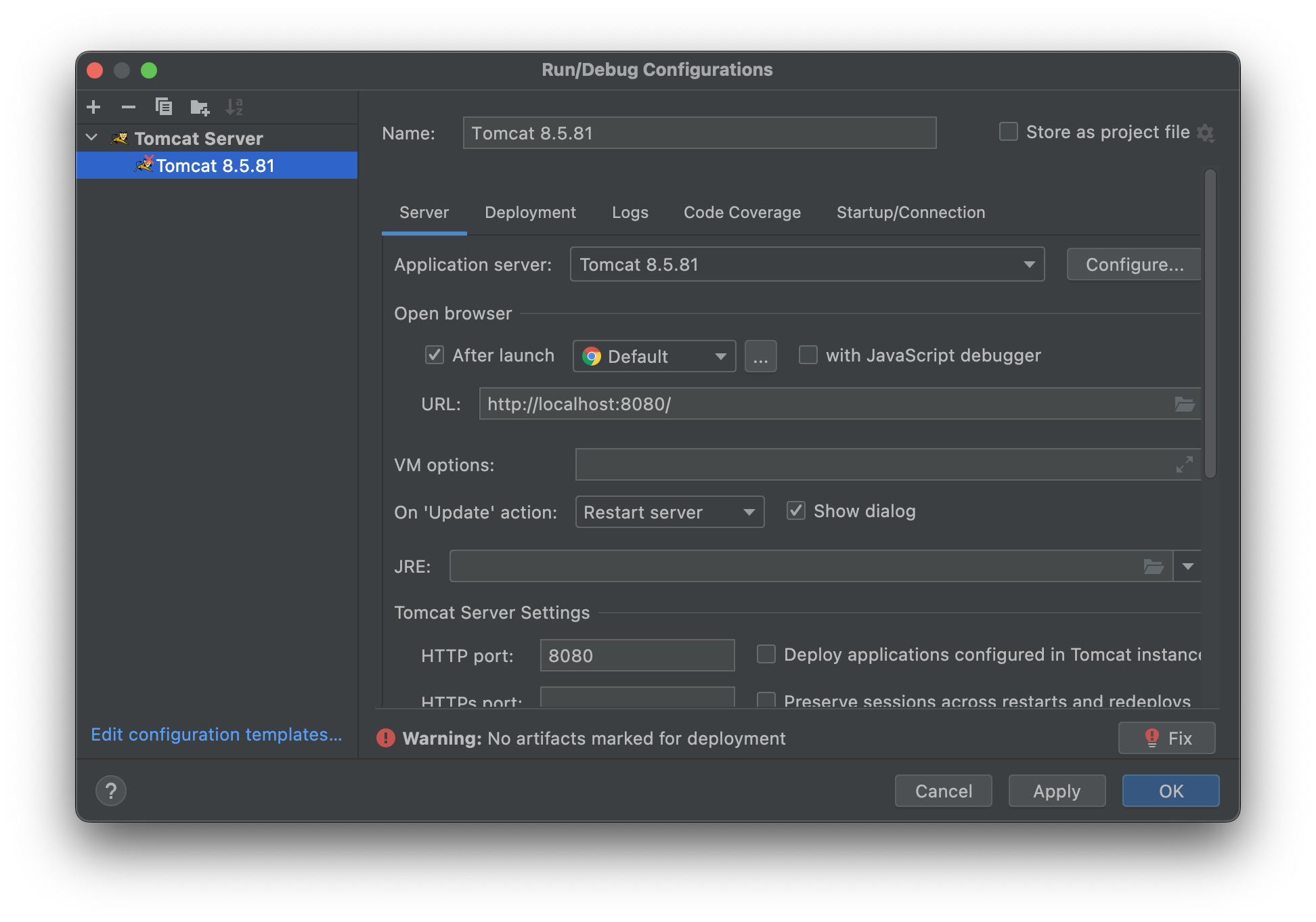 Fix를 누르면 바로 war 를 보여줄건지(deploy) 묻습니다. 클릭해서 추가하면 됩니다.