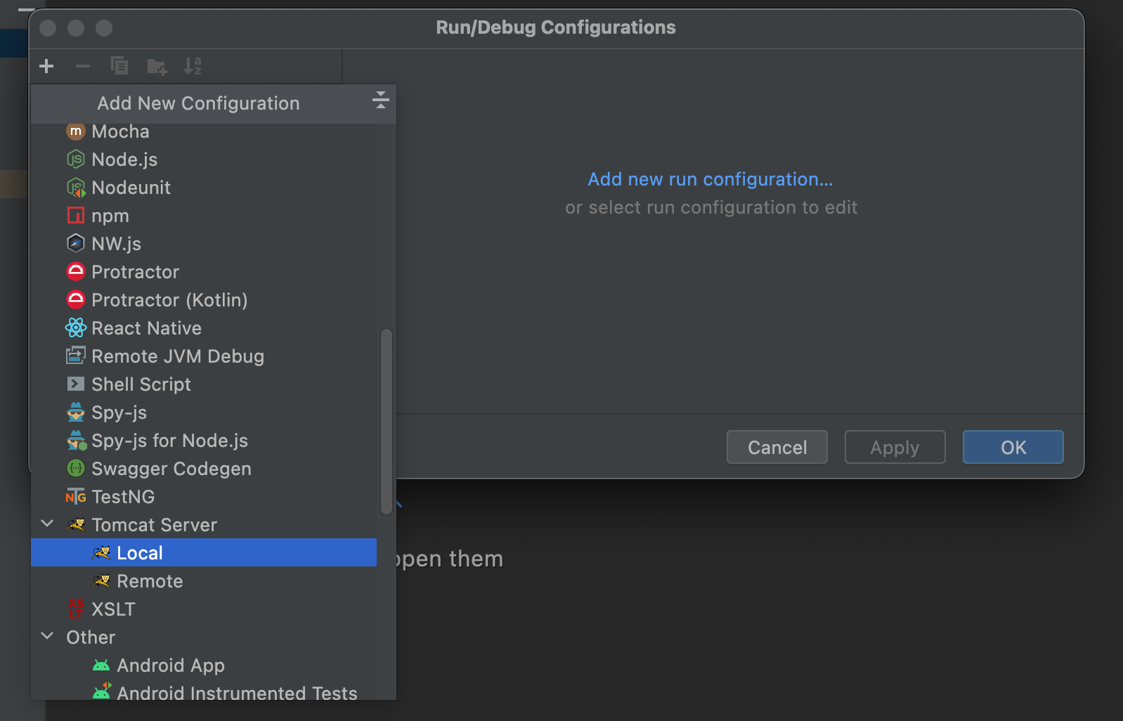 오른쪽 위 Add Configuration을 눌러서 창을 띄운 후에 왼쪽 위 +버튼을 눌러줍니다.