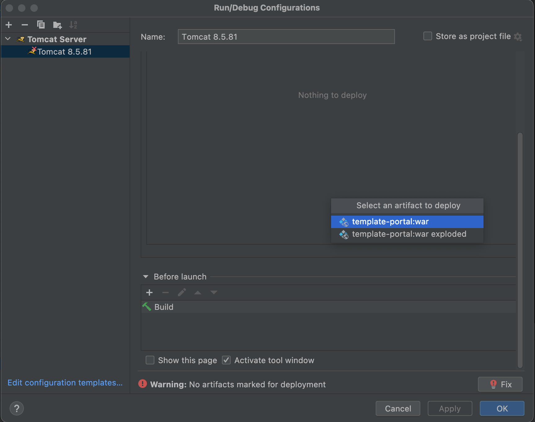 Fix를 누르면 바로 war 를 보여줄건지(deploy) 묻습니다. 클릭해서 추가하면 됩니다.
