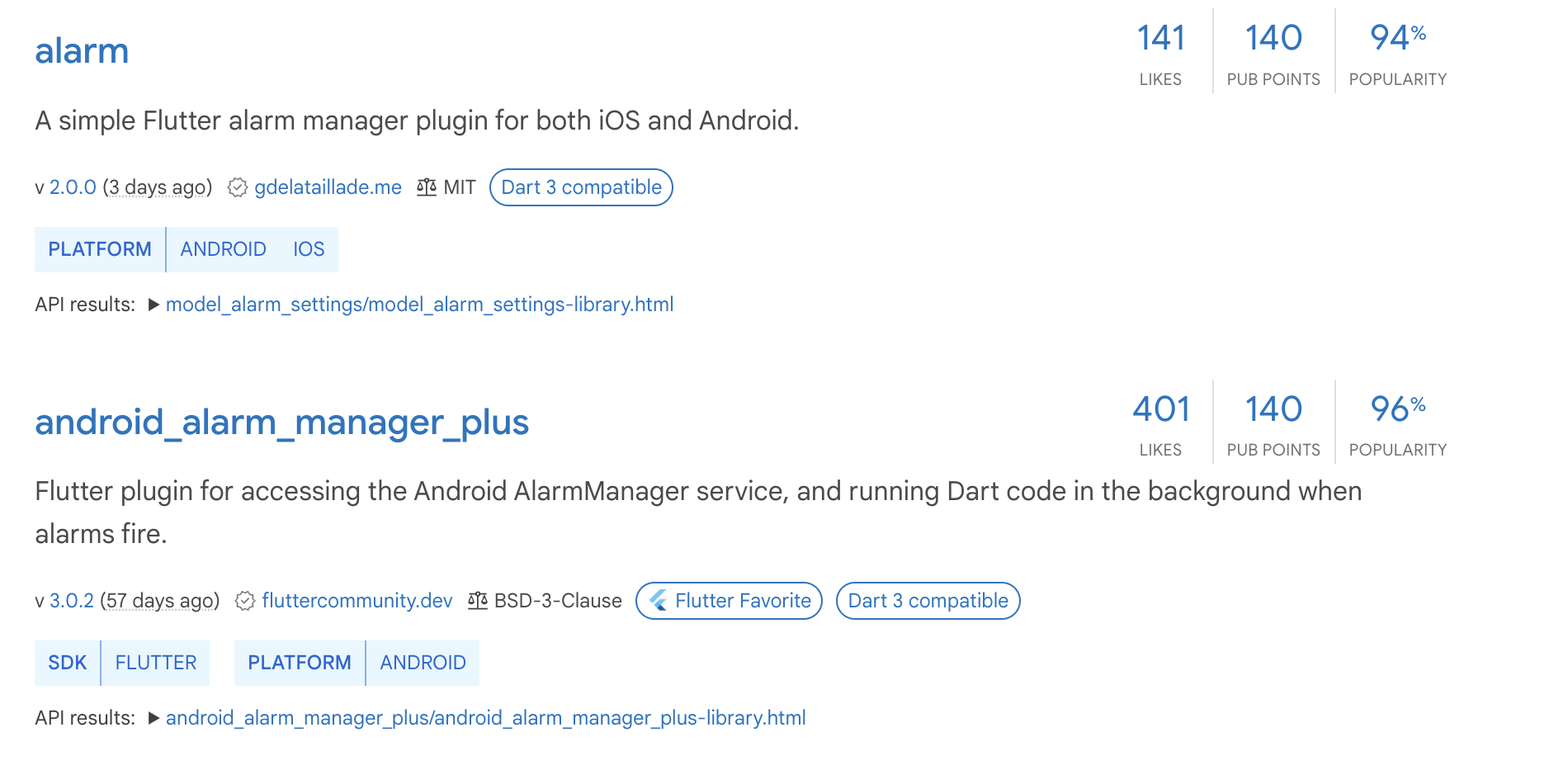 pub.dev에 들어가서 alarm 을 검색해보면 나오는 라이브러리 중에 두가지 alarm이 가장 인기있는데요